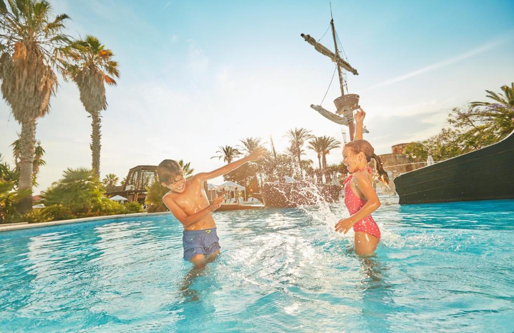 An invitation to experience a typical colonial-style Mexican Hacienda where strict attention has been paid to settings and detail. Its rooms are distributed over 6 buildings around a central area with spectacular gardens and irresistible crystalline water swimming pools, one of which features a sunken galleon where the kids will have hours of fun. This hotel, located at the gates of PortAventura Parks, has unlimited access to PortAventura Park throughout the stay and 1-day access to Ferrari Land included per stay and person (according to parks opening dates and times). Also offers preferential booking for table service restaurants in the parks via the hotel's Guest Service Desk and Pick-Up service at PortAventura Park and Ferrari Land shops. PortAventura Parks main entrance is just a 5-minute walk from the hotel. It has its own train station and it is just 20 minutes' drive from the high-speed train station, 3.5 km from the A-7 motorway and 10 minutes' drive from Reus airport. The all-inclusive rate offers lunch and dinner menus in the hotel's Mexican restaurant or in PortAventura Park and Ferrari Land, applicable to designated food outlets and subject to opening hours.